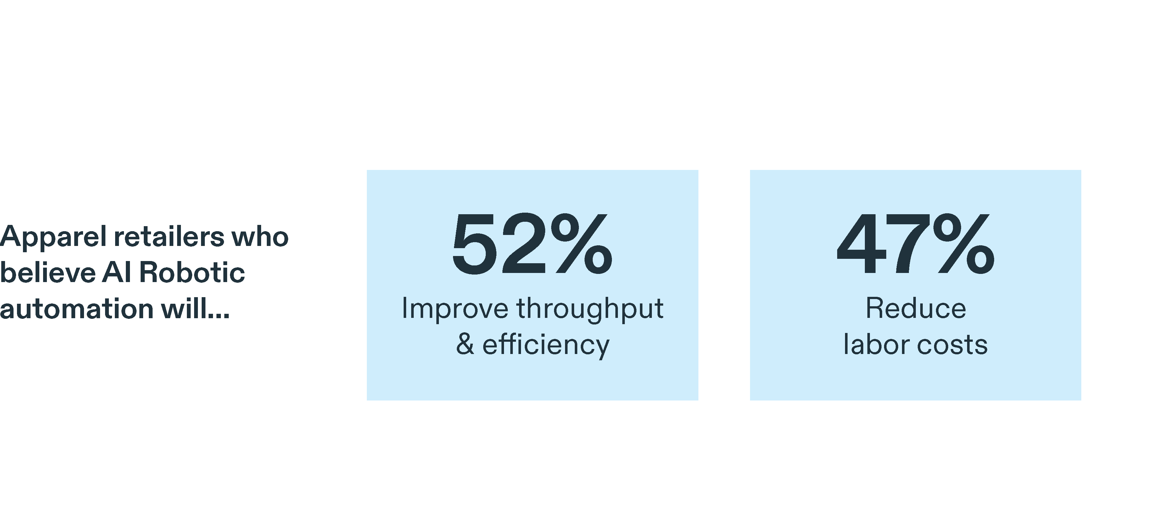 A majority of apparel retailers (52%) anticipate that AI Robotic automation will improve throughput and efficiency to keep up with competitors and customer demands while ensuring operational flexibility.