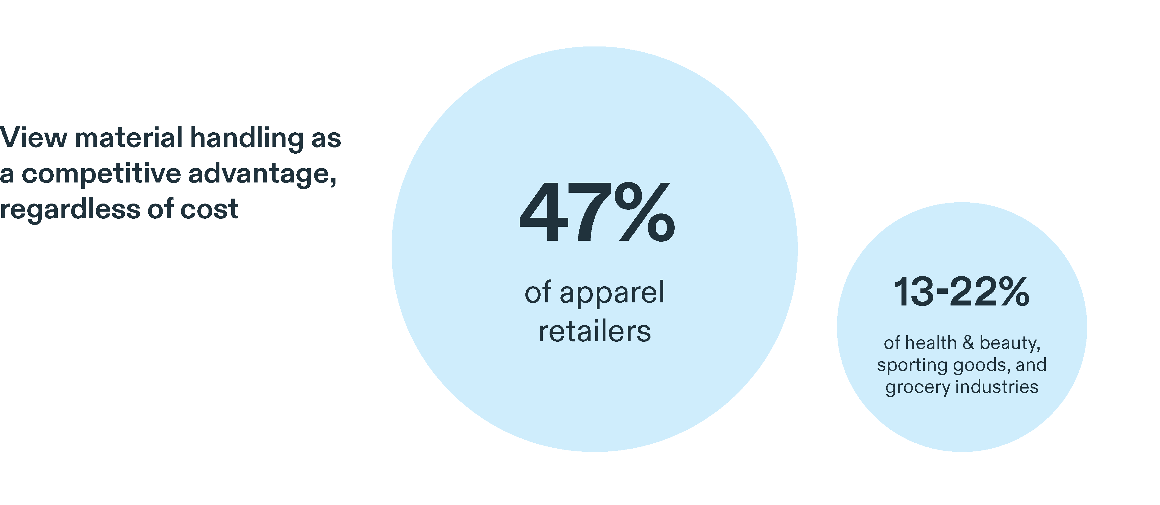 In a recent survey of 150 retail and logistics executives conducted by Covariant and Supply Chain Dive, apparel retailers stand out from all other verticals for their commitment to material handling. In fact, 47% of apparel retailers view material handling as a competitive advantage — no matter the costs involved. In comparison, only 13—22% of respondents in the health & beauty, sporting goods, and grocery industries saw material handling as a competitive advantage.
